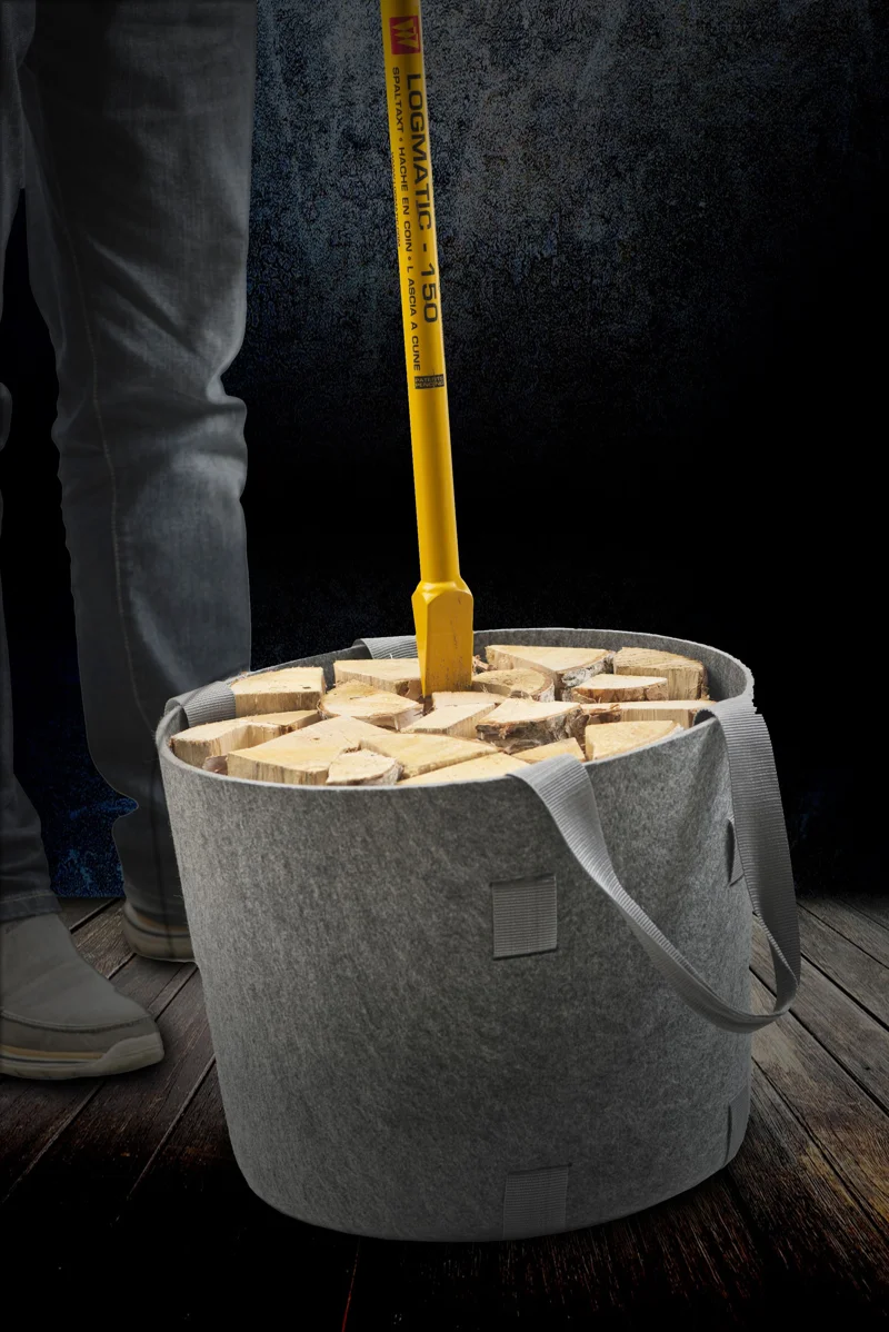 Cesto in feltro con basamento in legno per il taglio e il trasporto della legna, adatto anche per il contenimento del pellet.